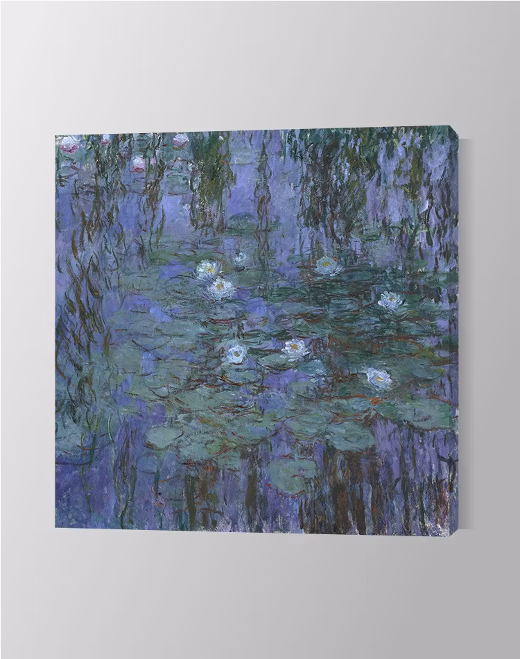 Superb giclée fine art reproduction of Blue Water Lilies by Claude Monet. The canvas print is Giclée printed and will literally last a lifetime on your wall without fading or changing colours. Museum quality. The print is stretched around pine wooden bars of highest quality, 1.6” (4cm) deep stretcher frame. Arrives ready to hang
