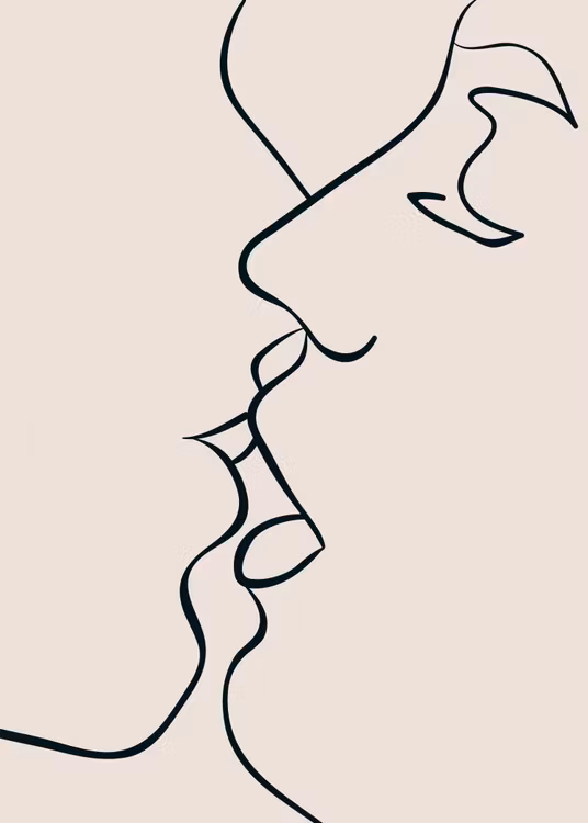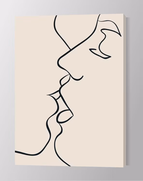 The First Kiss. Line Art by Insplendor Art Studio. Giclée printed canvas of superb quality, handmade in Sweden. The canvas print is stretched around pine wooden bars of highest quality 1.6 in (4 cm) deep stretcher frame, printed around the edges of the frame. Arrives ready to hang.